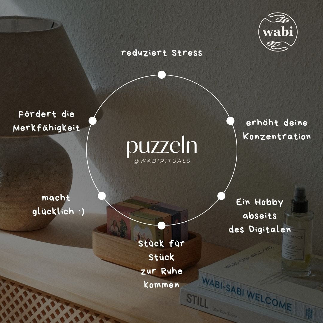 Entdecke mit wabi die wohltuende Kraft des Puzzelns. Es ist mehr als ein Hobby - ein Ritual, das Stress reduziert, Konzentration fördert und dich Stück für Stück zur Ruhe bringt. Gönn dir diese wertvolle Auszeit vom Digitalen und erlebe, wie jedes gefundene Teil Freude schenkt.